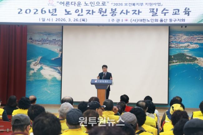 (원투원뉴스) 대한노인회 울산 동구지회(지회장 천두식)는 3월 26일 오전 10시와 오후 2시 2차례에 걸쳐 동구청 2층 대강당에서 2026년 동구 경로당 회원 자원봉사자 교육을 했다.