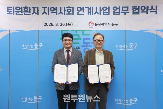 (원투원뉴스) 울산 동구는 3월 26일 오후 2시 퇴원 환자의 안정적인 지역사회 복귀를 지원하기 위해 상록수 요양병원과 퇴원 환자 지역사회 연계 업무 협약을 체결했다. 해당 의료기관은 퇴원 예정 환자중 돌봄이 필요한 고위험군을 선별하고 환자 평가표 등을 작성해 동구에 연계하는 역할을 맡는다.