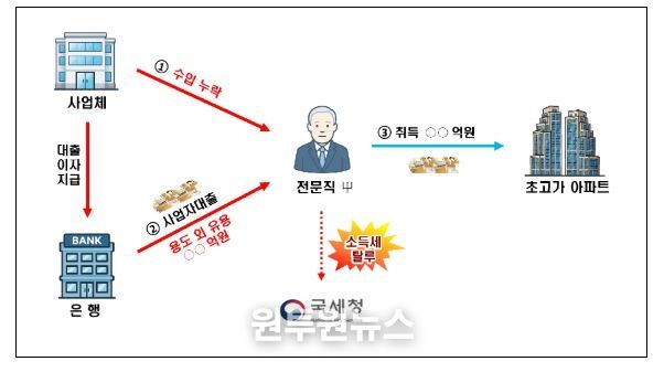 실제 고소득 전문직 사업자가 강남권 고가 아파트를 ○○여억 원에 취득하면서 ○○억 원의 사업자 대출금과 ○○억 원의 신고누락된 탈루자금을 사용한 것으로 드러났으며, 수년간 ○억 원에 달하는 사업자 대출 관련 이자를 경비 계상하여 탈세한 사실도 확인됐다.