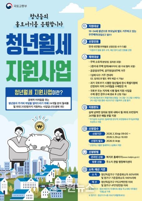 신청 기간은 3월 30일 오전 9시부터 5월 29일 오후 4시까지다. 월세 지원금은 소득·재산 조사 등을 거쳐 9월 23일부터 지급될 예정이며, 이후 매월 25일 지원된다.