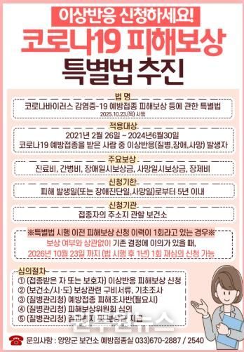 (원투원뉴스) 양양군 보건소는 지난 2025년 10월 23일부터 시행된 '코로나바이러스감염증-19 예방접종 피해보상 등에 관한 특별법'에 따라, 관련 피해보상 신청 접수 및 홍보에 적극 나서고 있다고 밝혔다.
