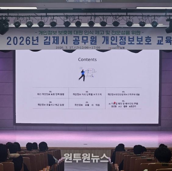 (원투원뉴스) 김제시는 27일 시청 대강당에서 전 직원을 대상으로 시민의 개인정보를 안전하게 보호하기 위해 외부 전문가를 초청해 ‘상반기 개인정보보호교육’을 실시했다고 밝혔다.