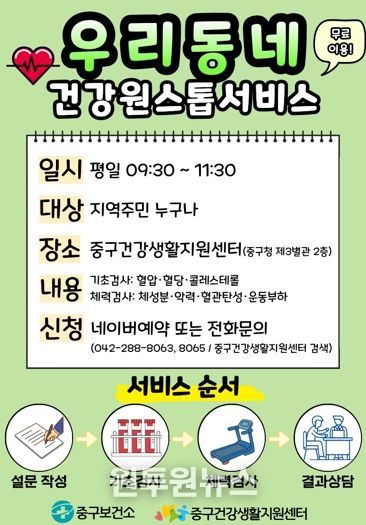 (원투원뉴스) 대전 중구는 지역주민이 다양한 검사를 한 번에 받을 수 있는 '우리동네 건강원스톱서비스'를 오는 4월 1일부터 중구건강생활지원센터에서 운영한다고 밝혔다.