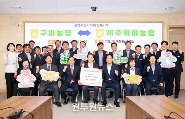 (원투원뉴스) 구미시는 지난 27일 구미농협과 제주 위미농협이 고향사랑기부제 활성화와 지역 간 상생협력을 위해 각각 1,000만 원을 상호기부했다고 밝혔다.