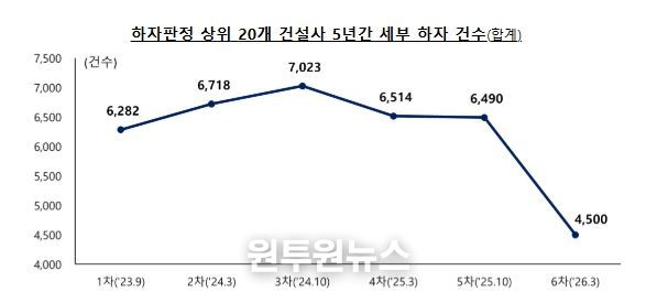 최근 5년(’21.3~’26.2) 누계 기준으로는 지우종합건설(주)(2,660.0%), 삼도종합건설(주)(1,687.5%), (주)지향종합건설(1,681.3%), 혜성종합건설(주) (1,300.0%), (주)백운종합건설(741.7%) 순으로, 이는 지난 5차 발표(’25.10)시 건설사 순위와 유사하다.