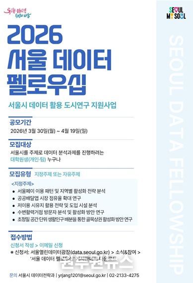 시는 3월 30일부터 4월 19일까지 ‘2026 서울 데이터 펠로우십’ 참여자를 모집하고, 대학원생 등 청년 분석 인재를 중심으로 도시문제 해결 프로젝트를 추진한다고 밝혔다.