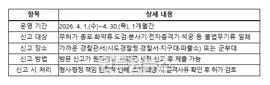 (원투원뉴스) 경찰청은 불법무기류로 인한 범죄와 사고를 미리 방지하기 위하여 국방부 및 행정안전부와 합동으로 4월 1일부터 30일까지 한 달간 '2026년 1차 불법무기류 자진신고 기간'을 운영한다.