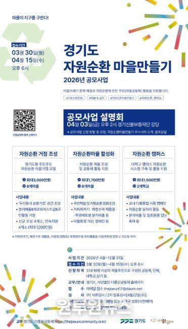 (원투원뉴스) 경기도가 주민 주도의 자원순환 실천 확산을 위해 ‘2026년 자원순환마을 만들기’ 공모사업을 추진하고, 오는 3월 30일부터 참여 공동체를 모집한다. 이번 사업은 마을 단위에서 발생하는 생활폐기물 문제를 주민 스스로 해결하고 지속가능한 순환경제 체계를 구축하는 주민참여형 모델이다.
