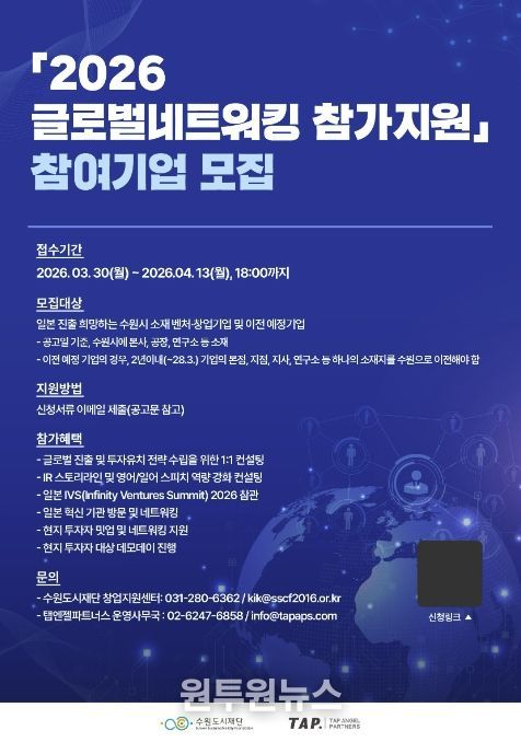 (원투원뉴스) 수원특례시가 ‘2026 글로벌네트워킹 참가지원’에 참여할 벤처·창업 기업 7개사를 3월 30일부터 4월 13일까지 모집한다.