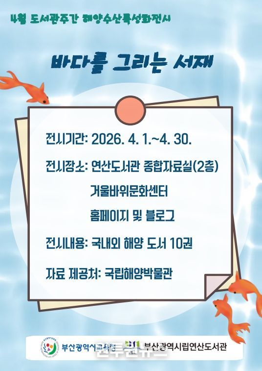 (원투원뉴스) 부산광역시립연산도서관은 2026년 도서관의 날 및 도서관주간을 맞아 오는 4월 1일부터 30일까지 도서관에서 지역주민과 이용자를 대상으로 해양수산 특성화 전시회 ‘바다를 그리는 서재’를 운영한다.