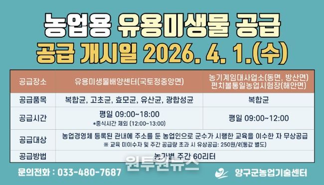 공급 대상은 양구군에 주소를 둔 농업경영체 등록 농업인으로, 미생물의 올바른 사용과 오남용 방지를 위해 군 주관 ‘미생물 활용 교육’을 이수한 농가는 농가당 주간 60리터 무상으로 제공되며, 교육 미이수 농가와 주간 60리터 초과 농가는 250원/ℓ에 구입할 수 있다.