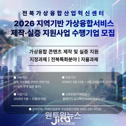 (원투원뉴스) 전주시와 (재)전주정보문화산업진흥원은 전북가상융합산업혁신센터의 지역 내 가상융합산업 인프라를 활용해 지역 현안을 해결하고 특화산업의 디지털 전환을 이끌 ‘2026년 지역기반 가상융합서비스 제작·실증 지원사업’의 수행기업을 모집한다.