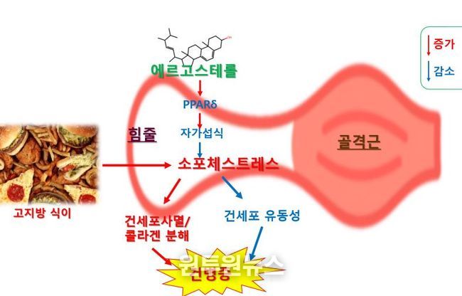 특히 포화지방산인 팔미테이트는 소포체 스트레스를 유발해 단백질 항상성을 무너뜨리고, 힘줄 세포의 사멸과 콜라겐 분해를 촉진해 조직 퇴행으로 이어질 수 있다. 그러나 현재 치료는 통증 완화와 물리적 재활에 집중돼 있어, 세포 수준의 병리 기전을 직접 해결하는 데 한계가 있었다.