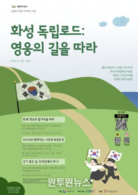 오는 4월에는 대표 프로그램인 ‘만세! 영웅의 발자국을 따라’를 진행한다. 참가자들은 화성 3·1운동 만세길을 직접 걸으며 스토리텔링형 연극에 참여해 당시 지역 독립운동의 열기를 경험할 수 있다. 프로그램은 무료로 제공하며, 3월 31일부터 포스터 하단의 QR코드를 이용해 참가 신청을 접수할 예정이다.