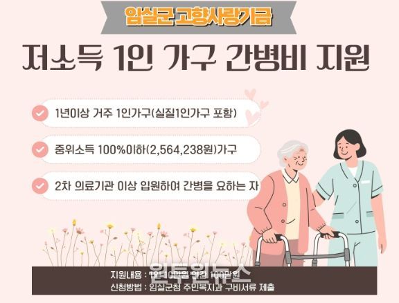 ▲지원대상은 1년이상 거주하고 있는 1인가구 및‘실질적 1인가구’로 기준중위소득 100%이하(1인 2,564,238원) ▲지원내용은 1일 최대 10만원, 연간 100만원 한도로 신청인 또는 간병협회 계좌로 입금 ▲신청방법은 의료기관 또는 신청인 본인이 임실군청 주민복지과로 신청하며, 진단서 및 간병사실확인서 등 구비서류를 제출해야 한다.