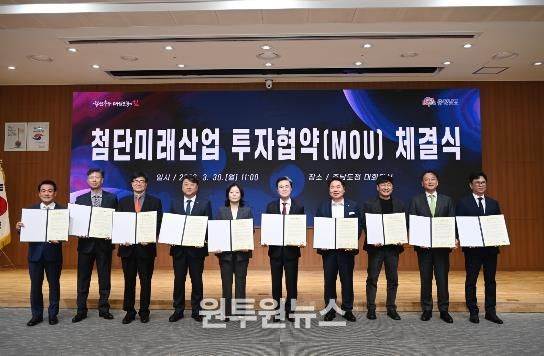 김태흠 지사는 30일 도청 대회의실에서 오세현 아산시장 등 3개 시군 시장·군수, 김동회 디앤알파트너스 대표이사 등 6개 기업 대표와 투자협약(MOU)를 체결했다.