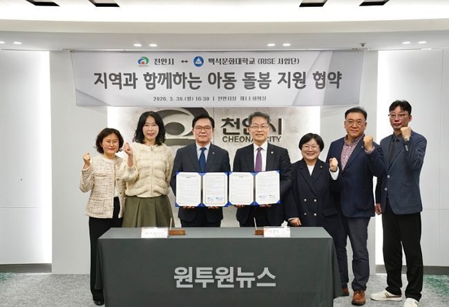 (원투원뉴스) 천안시는 30일 시청 소회의실에서 백석문화대학교(RISE사업단)와 ‘지역 인재양성 및 아동 돌봄 지원 협력 강화를 위한 업무협약’을 체결했다.