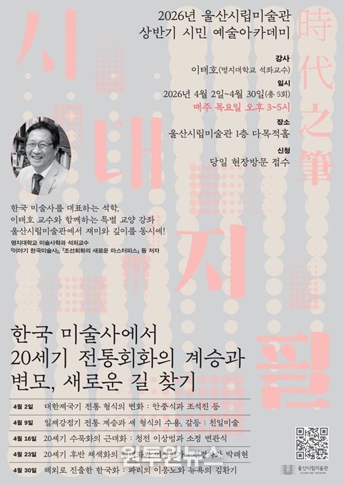 울산시립미술관 관계자는 “이번 시민 예술아카데미는 다소 어렵게 느껴질 수 있는 한국 미술사를 쉽고 흥미롭게 풀어낸 입문 강좌”라며 “전통과 현대를 잇는 한국화의 흐름을 이해하는 뜻깊은 시간이 될 것”이라고 말했다.