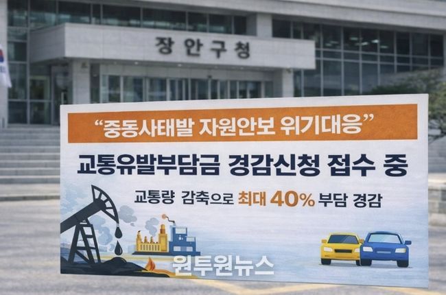 (원투원뉴스) 수원시 장안구는 중동사태 자원안보 위기 주의경보에 따른 승용차 이용 감소 유도 및 에너지 절약 정책의 일환으로, 교통량 감축활동을 이행한 시설물을 대상으로 교통유발부담금 경감신청을 받는다고 밝혔다.