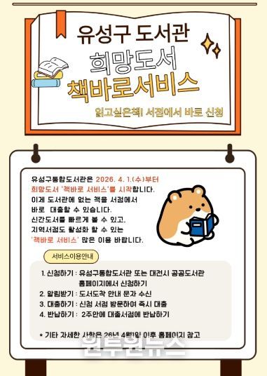 정용래 유성구청장은 “이번 서비스를 통해 책을 기다리는 시간을 줄이고 독서 접근성이 향상되길 바란다”라며 “앞으로도 지역 서점과 상생하는 독서 정책을 확대하겠다”라고 말했다.