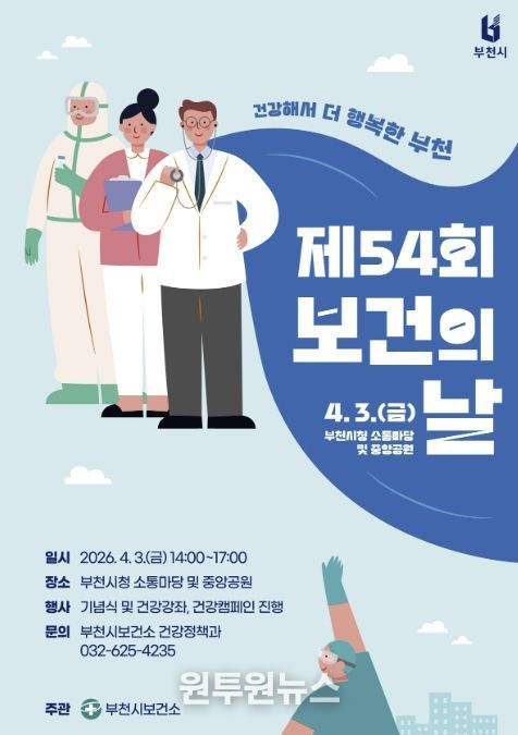 (원투원뉴스) 부천시는 4월 3일 ‘제54회 보건의 날’을 맞아 부천시청 소통마당에서는 기념식과 건강강좌를, 중앙공원 일대에서는 건강캠페인을 진행하며 ‘건강해서 더 행복한 부천’을 슬로건으로 기념행사를 연다.