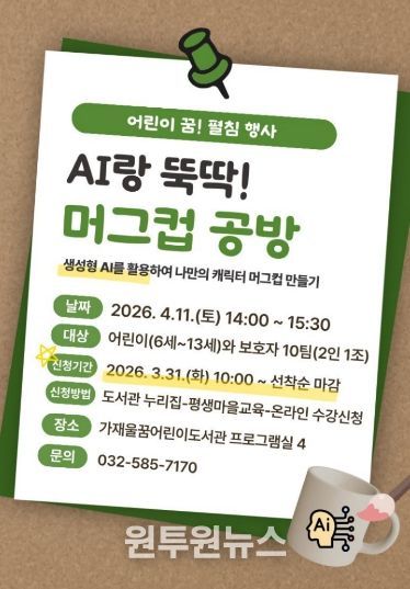 (원투원뉴스) 인천광역시교육청서구도서관은 오는 4월, 어린이를 동반한 가족이 참여하는 생성형 AI를 활용한 특별 프로그램 ‘AI랑 뚝딱! 머그컵 공방’을 운영한다.