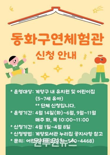 (원투원뉴스) 인천광역시교육청계양도서관은 4월 1일부터 계양구 관내 어린이집과 유치원(5~7세)을 대상으로 ‘동화구연 체험관’에 참여할 기관을 모집한다.