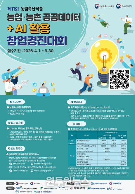 (원투원뉴스) 농림축산식품부는 9개 농식품 관계기관과 함께 농업‧농촌 AI 대전환(AX)을 선도할 다양한 창업가들을 육성하기 위한 ‘제11회 농업‧농촌 공공데이터+AI 활용 창업경진대회’를 개최한다.