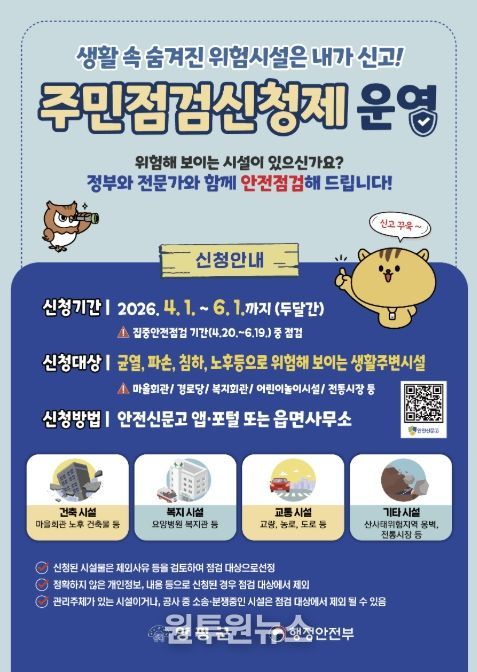 희망자는 오는 4월 1일부터 6월 1일까지 각 읍면사무소를 방문하거나 ‘안전신문고’ 누리집 또는 모바일 앱을 통해 신청할 수 있다. 분야별 전문가와 공무원은 4월 20일부터 6월 19일까지 진행되는 ‘2026년 집중안전점검’ 기간 동안 선정된 대상지를 합동 점검하고, 그 결과를 신청인과 관리 주체에 공유할 예정이다.