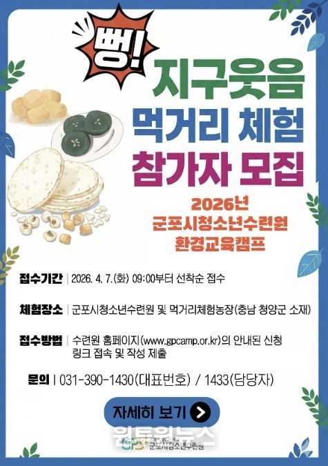 (원투원뉴스) (재)군포시청소년재단이 운영하는 군포시청소년수련원(충남 청양군 소재)은 오는 5월 9일~ 5월 10일 주말 이틀간 ‘2026년 환경교육캠프(뻥! 지구웃음 먹거리 체험’을 운영한다.