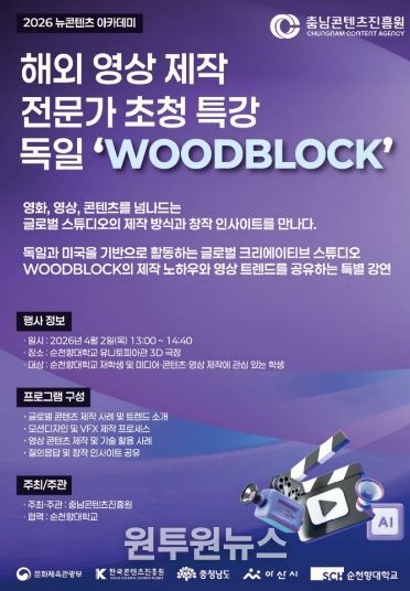 (원투원뉴스) 충남콘텐츠진흥원은 오는 4월 2일 순천향대에서 ‘2026 뉴콘텐츠 아카데미’의 일환으로 글로벌 콘텐츠 제작 전문가 초청 특강을 개최한다고 밝혔다.