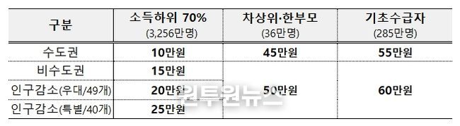 소득 하위 70% 국민에게 거주 지역별로 수도권 10만원, 비수도권 15만원, 인구감소 우대지역 20만원, 인구감소 특별지역 25만원을 지급할 예정이며, 한부모가족・차상위계층은 45만원, 기초생활수급자는 55만원을 지급하되 비수도권에 거주하는 경우에는 1인당 5만원을 추가 지급한다.