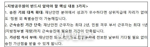 근속 승진 기회도 단축된다. 특히 재난안전 분야에서 2년 이상 근무한 공무원의 경우, 현재 1년까지 단축 가능한 근속승진 기간을 최대 2년까지 단축할 수 있도록 의무화했다.