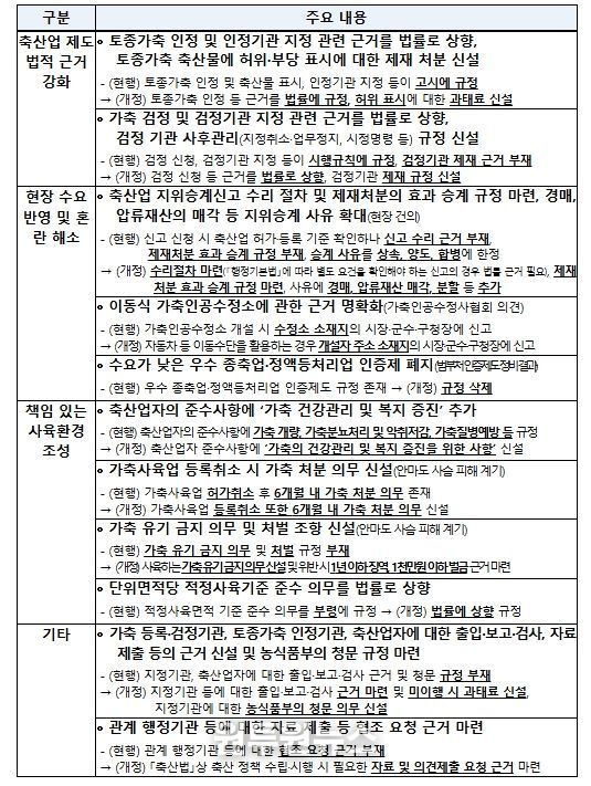 이번 개정은 축산업의 지속 가능한 발전을 도모하기 위해 ▲가축 유기 방지 등 책임 있는 사육 환경을 조성하고, ▲토종가축 표시의 신뢰성을 제고하는 한편, ▲지위승계 제도 개선, ▲이동형 가축인공수정소 신고 기준 개선 등 현장 중심의 제도 정비에 중점을 두었다. 이번 개정된 법률은 공포 후 1년이 경과한 ’27년 4월부터 시행될 예정이다.