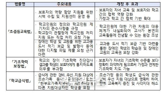 교육부는 이번 법률 개정을 통해 국가와 지방자치단체가 보호자의 역량 함양과 교육 정책에 대한 이해 및 소통을 지원하기 위한 시책을 수립하도록 했다. 또한 학부모 정책 추진을 위한 실태조사와 함께 보호자 교육에 행정·재정적 지원을 할 수 있는 근거를 마련했다. 아울러 보호자 교육과 보호자의 학교 참여 등에 대한 정보를 제공하는 전국‧지역 학부모지원센터의 설치·운영 근거도 신설했다.
