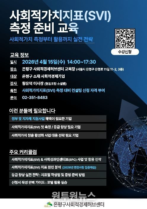 (원투원뉴스) 서울 은평구는 오는 15일 은평구 사회적경제허브센터에서 사회적경제기업을 위한 ‘사회적가치지표(SVI) 측정 준비 교육’을 실시한다고 밝혔다.