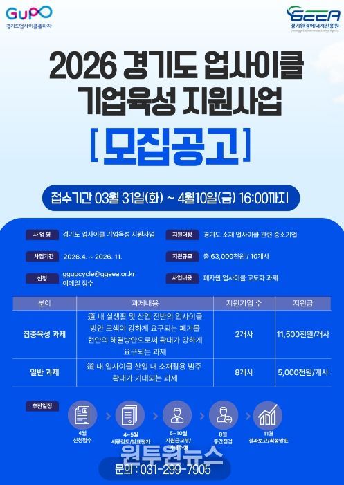 (원투원뉴스) 경기환경에너지진흥원이 업사이클 기업을 발굴해 기술 고도화와 사업화를 돕는 ‘경기도 업사이클 기업육성 지원사업’ 참여기업을 10일까지 모집한다.