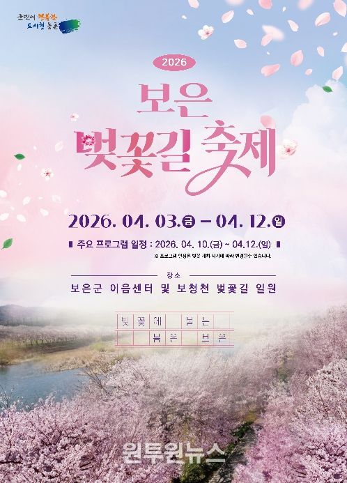 (원투원뉴스) 충북 보은군에서 오는 4월 3일부터 4월 12일까지 10일간 보은군 이음센터 및 보청천 벚꽃길 일원에서 ‘2026 보은 벚꽃길 축제’가 열린다.