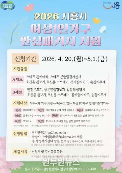 (원투원뉴스) 시흥시는 관내 여성 1인 가구 등의 안전한 일상 보호를 위해 ‘2026년 시흥시 여성 1인 가구 안심패키지 지원사업’을 추진하고, 오는 4월 20일부터 5월 1일까지 신청을 받는다.