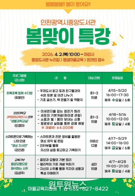 (원투원뉴스) 인천광역시교육청중앙도서관은 4월부터 지역주민의 배움과 여가를 지원하기 위하여, 다양한 연령층을 대상으로 ‘봄맞이 특강’을 운영한다.