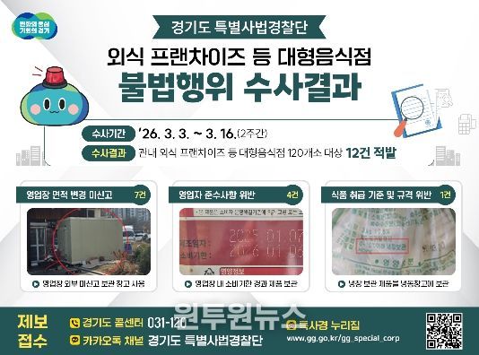 (원투원뉴스) 경기도 특별사법경찰단은 지난 3월 3일부터 16일까지 도내 외식 프랜차이즈 등 대형음식점 120개소를 대상으로 집중 수사를 실시한 결과 영업장 면적 변경 미신고 및 영업자 준수사항 위반 등 총 12건의 불법행위를 적발했다.