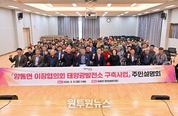 이번 사업은 양동면 내 공공 유휴부지에 약 700kW 규모의 태양광발전소를 구축해 마을별 연간 약 400만 원의 고정 수익을 창출하고, 이를 주민복지사업과 마을공동체 활성화에 활용할 계획이다.