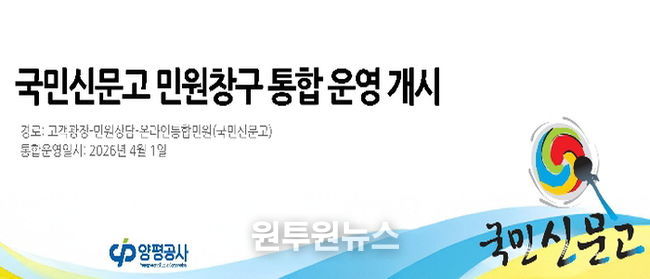 (원투원뉴스) 양평공사는 군민 중심의 민원 서비스를 강화하고 민원 처리의 신속성과 효율성을 높이기 위해 국민권익위원회가 운영하는 ‘국민신문고’ 시스템을 도입해, 4월 1일부터 전 시설을 대상으로 통합 민원창구 운영을 전면 시행한다고 밝혔다.