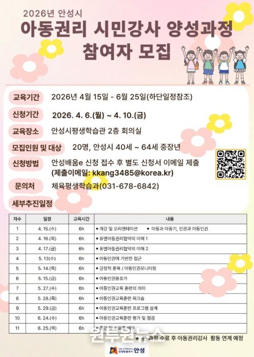 안성시 관계자는 “이번 과정이 중장년층의 새로운 사회참여 기회를 제공하는 동시에, 지역사회에 아동권리 문화가 확산되는 계기가 되기를 기대한다”고 말했다.