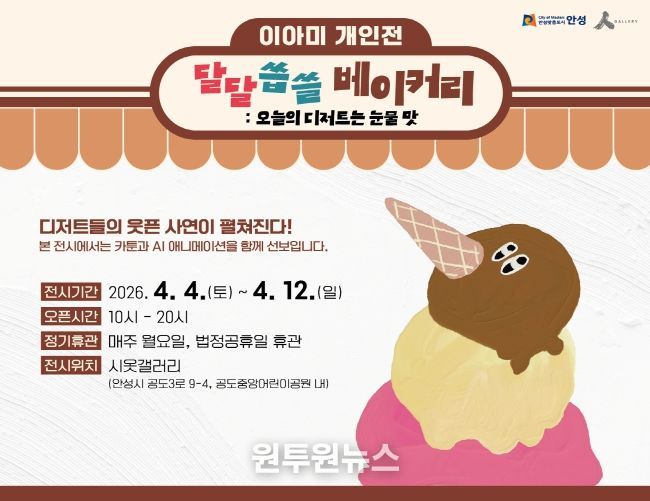 (원투원뉴스) 공도 작은미술관 시옷갤러리에서는 일상 속 감정을 유머와 은유로 풀어낸 카툰·애니메이션 전시 '달달씁쓸 베이커리: 오늘의 디저트는 눈물 맛'을 오는 4월 4일부터 4월 12일까지 개최한다. 이번 전시는 누구나 익숙하게 접하는 디저트를 매개로, 불안·상실·비교·소외·기쁨 등 현대인이 마주하는 다양한 감정을 섬세하면서도 위트 있게 풀어낸다.
