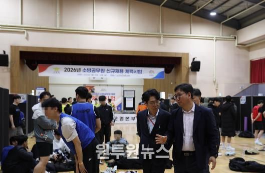 (원투원뉴스) 성호선 충남소방본부장은 1일 예산군 삽교읍 국민체육센터에서 진행 중인 ‘2026년도 소방공무원 신규 채용 체력시험’ 현장을 찾아 응시생들과 시험 감독관 등을 격려했다.