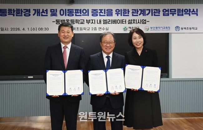 (원투원뉴스) 해운대구는 1일 부산시교육청, 동백초와 ‘통학환경 개선 및 이용편의 증진을 위한 업무협약’을 체결하고 동백초 앞 엘리베이터 설치에 나섰다.