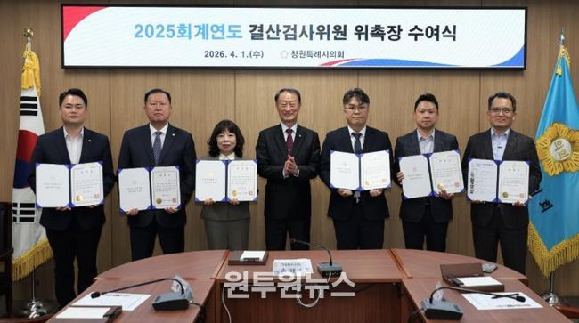 (원투원뉴스) 창원특례시의회는 1일 ‘2025회계연도 결산검사위원’을 위촉했다. 결산검사 대표위원은 백승규 의원이 맡았다.