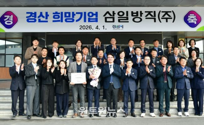 (원투원뉴스) 경산시는 2026년 2분기 경산 희망기업으로 삼일방직(주)을 선정하고, 1일 시청 대회의실에서 경산 희망기업 선정식을 가져 트로피와 현판을 수여했다.