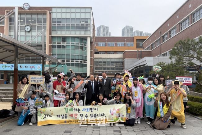 (원투원뉴스) 충청북도청주교육지원청은 4월 1일 등교시간에 맞춰 오창읍 소재 각리중학교를 찾아 각리중학교 교직원과 학생회 학생 및 또래상담부와 함께 하는 합동 캠페인을 진행했다. 이번 캠페인에서는 생명존중을 위한 리플렛을 제공함으로서 생명존중 및 자살예방 활동을 진행했고, 학교폭력 예방을 위한 구호를 통해 학교폭력의 심각성을 공유하여, 예방과 해결책을 모색하는 기회를 마련했다,